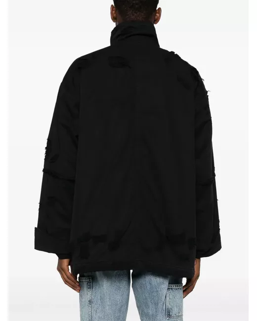 black cotton distressed finish panel detailing concealed front press-stud and zip fastening stand-up collar long sleeves embroidered logo at the sleeve turn-up cuffs two chest flap pockets two press-stud fastening side pockets quilted lining internal pocket straight hem
