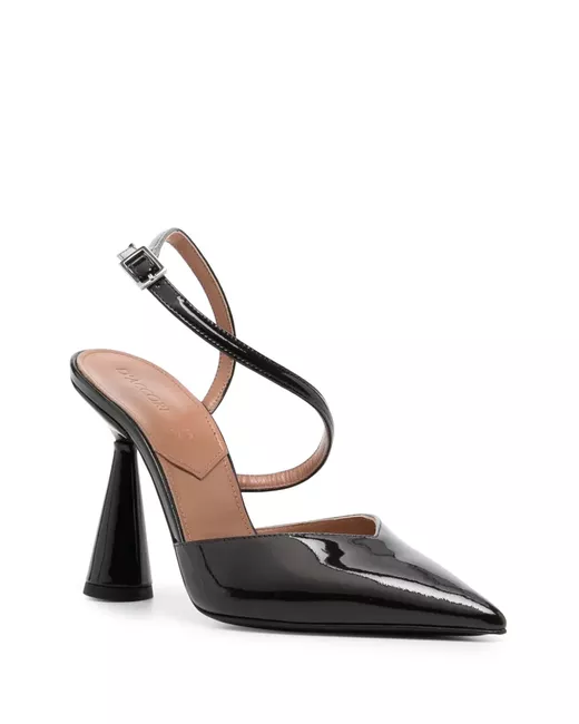 coffee brown leather patent finish sculpted heel branded footbed buckle-fastening ankle strap pointed toe