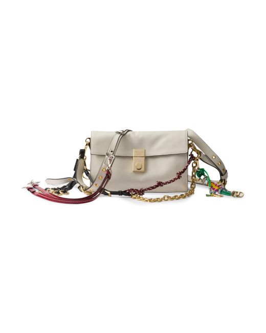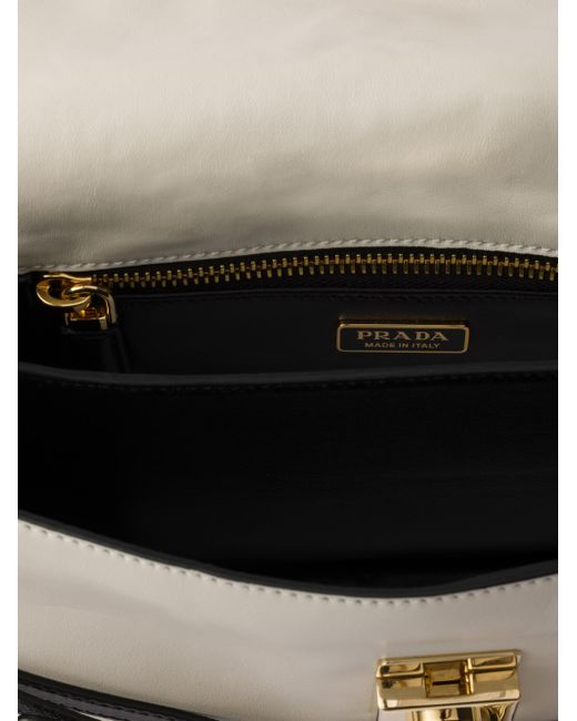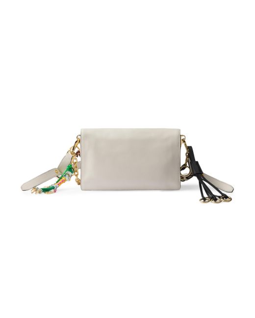 Contemporary and versatile, the new Prada Soft Sound bag is crafted from leather with a compact, two-compartment design, finished with gold-toned hardware. The accessory boasts various removable bag charms that decorate with a playful and unique touch. Adjustable and detachable leather shoulder strap. Maximum length 90 cm - Minimum length 58 cm - Maximum drop 50 cm - Minimum drop 32 cm Detachable bag charms: key ring, rings, robot charm, cord and chain charm Metal hardware Engraved lettering logo on clasp Flap closure with snap buckles Nappa leather lining with two compartments and two pockets, one with zipper Imported 100% Calf Leather 9.4'' W x 5.3'' H x 2.3'' L. Lsd Handbags - Prada Handbags Access > Prada > Saks Fifth Avenue > Barneys. Prada. Color: White.