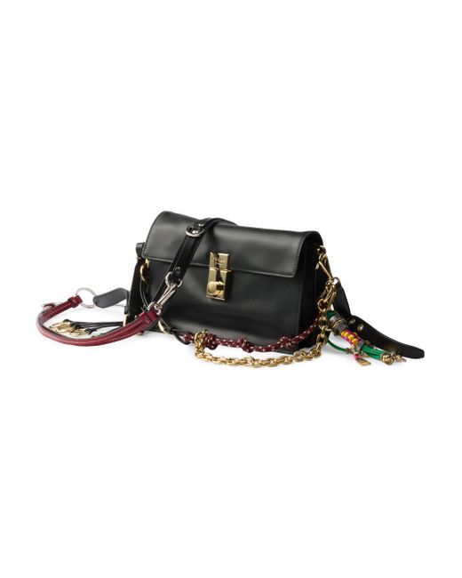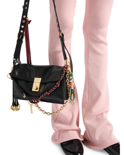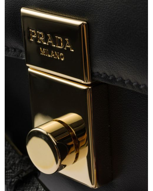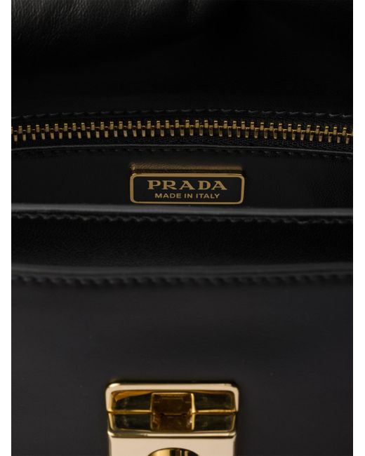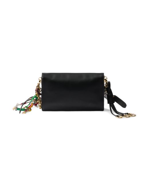 Contemporary and versatile, the new Prada Soft Sound bag is crafted from leather with a compact, two-compartment design, finished with gold-toned hardware. The accessory boasts various removable bag charms that decorate with a playful and unique touch. Adjustable and detachable leather shoulder strap. Maximum length 90 cm - Minimum length 58 cm - Maximum drop 50 cm - Minimum drop 32 cm Detachable bag charms: key ring, rings, robot charm, cord and chain charm Metal hardware Engraved lettering logo on clasp Flap closure with snap buckles Nappa leather lining with two compartments and two pockets, one with zipper Imported 100% Calf Leather 9.4'' W x 5.3'' H x 2.3'' L. Lsd Handbags - Prada Handbags Access > Prada > Saks Fifth Avenue > Barneys. Prada. Color: Black.