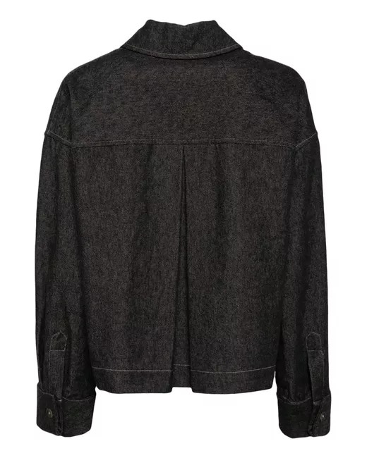smoky black cotton blend denim classic collar front button fastening two front flap pockets drop shoulder long sleeves turn-up cuffs buttoned cuffs straight hem