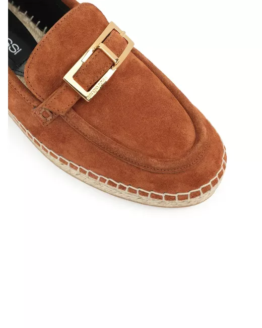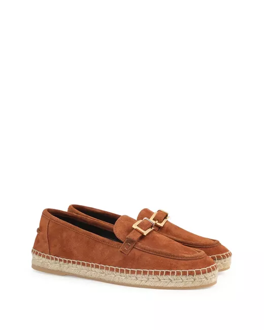 brown calf suede decorative buckle detail round toe slip-on style branded insole jute sole