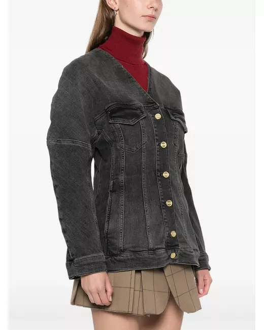 black organic cotton blend denim front button fastening boned bodice V-neck long sleeves buttoned cuffs two chest flap pockets straight hem