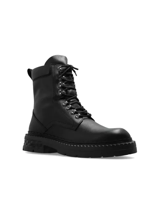 black calf leather smooth grain logo pull-tab round toe front lace-up fastening ankle-length signature diamond-pattern outsole stacked heel ridged rubber sole