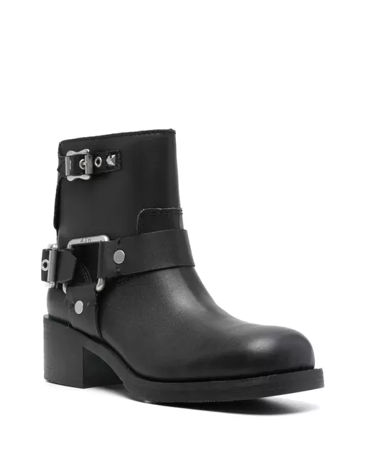 black leather smooth grain 50mm block heel decorative buckle detailing square toe branded insole rubber sole