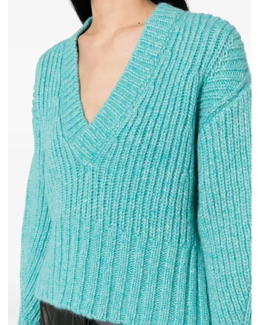 aqua blue wool-cotton-alpaca wool blend chunky knit V-neck long sleeves drop shoulder cropped straight hem