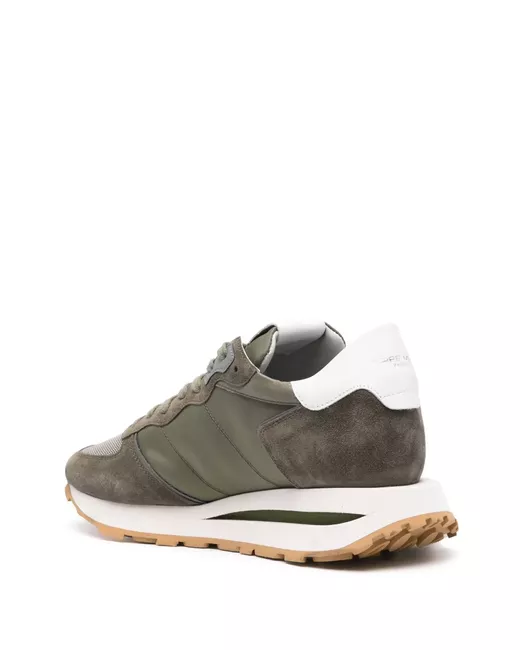 olive green panelled design suede panels mesh panelling almond toe appliqué logo logo patch at the tongue branded heel counter branded insole chunky rubber sole front lace-up fastening