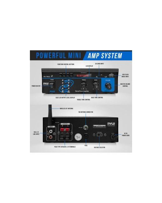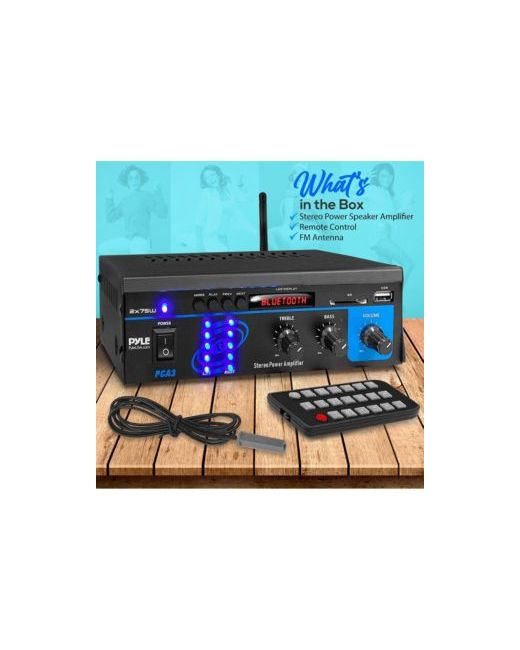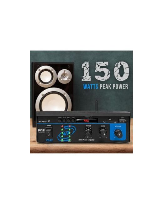 The Pyle Stereo Power Speaker Amplifier delivers 150 watts of max power output in a compact design. This mini amplifier system is perfect for powering your home audio system, offering multiple input options including Rca, Usb, Sd, and Bluetooth wireless streaming. With treble, bass, and master volume controls on the front panel, this amplifier allows you to fine-tune your sound. It also includes an Fm antenna for radio listening and features a blue Led output level display for a modern look.