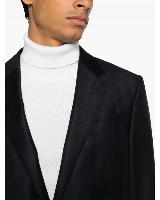 navy blue wool Prince of Wales check pattern Jacket: notched lapels front button fastening long sleeves buttoned cuffs jetted chest pocket two front flap pockets English rear vents Trousers: slim cut pressed crease belt loops off-centre front button fastening and zip fly fastening two side inset pockets two rear welt pockets