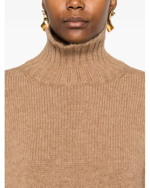 camel brown alpaca wool-blend knitted construction mélange effect ribbed trim high neck drop shoulder long sleeves straight hem