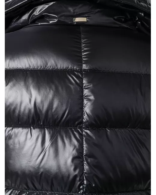 black down-feather filling two-way zip fastening padded design glossy finish quilted finish spread collar three-quarter length sleeves two side zip-fastening pockets A-line straight hem