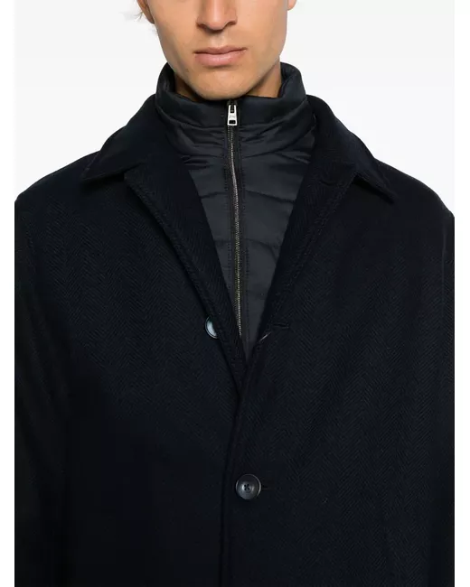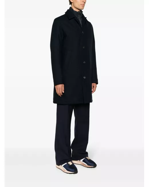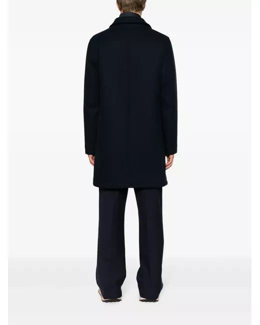 navy blue virgin wool layered design classic collar front button fastening long sleeves two side inset pockets mid-length straight hem