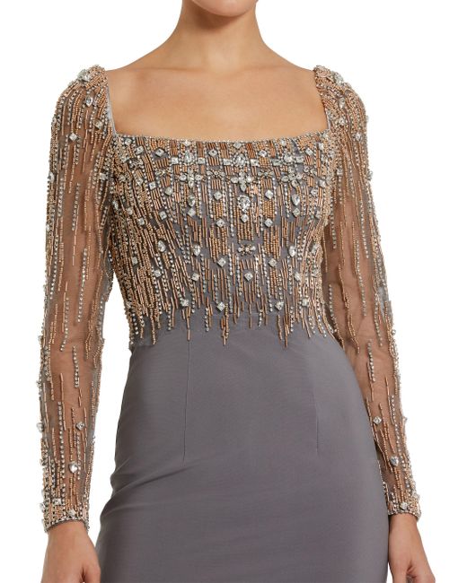 Mac Duggal's stunning column gown showcases intricate beading at the square neck bodice and illusion long sleeves. Square neck Long sleeves Concealed back zip closure 100% polyester Lining: 100% polyester Spot clean Imported SIZE & FIT About 61" from shoulder to hem Model measurements: 5'10" tall Model is wearing a US size 4. Dress Collections - Mac Duggal > Mac Duggal > Saks Fifth Avenue > Barneys. Mac Duggal. Color: Platinum Gold. Size: 2.
