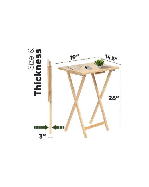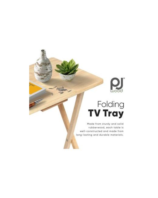 Get ideal convenience and sleek design all-in-1 with the 2-piece set of Pj Wood Folding Tv Tray Tables. These folding Tv trays by Pj Wood are the best go-to tray tables. They come in handy for those nights when you're not in the mood to sit at the table, and just want to relax and eat in front of the Tv. They're also great for when you bring the office home, and just want an easy way to sit down and get some work done. These tray tables expand and collapse with ease. Rectangular in shape and made from solid wood, these tables feature a flat, spacious, conventional tabletop that makes them perfect for versatile use. The solid wood construction ensures that these tables stand up against time. The trays store easily behind a door, in a closet, or even behind your sofa. Collapse each table when finished for easy and compact storage.