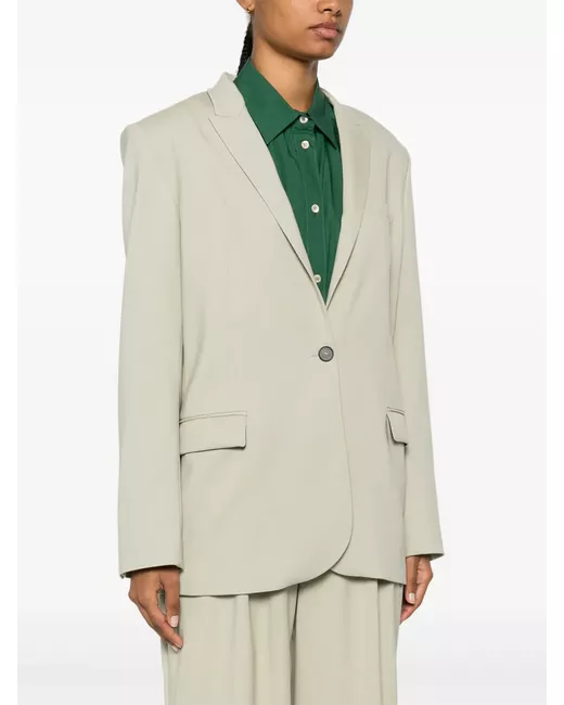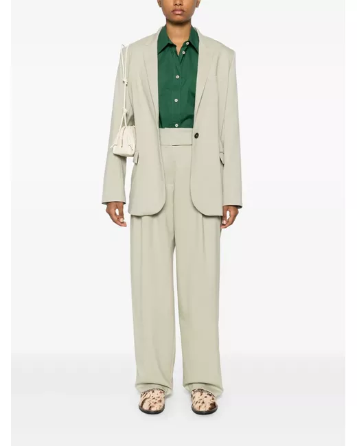 sage green wool blend twill weave front button fastening peak lapels shoulder pads long sleeves chest welt pocket buttoned cuffs two front flap pockets American rear vent full lining straight hem
