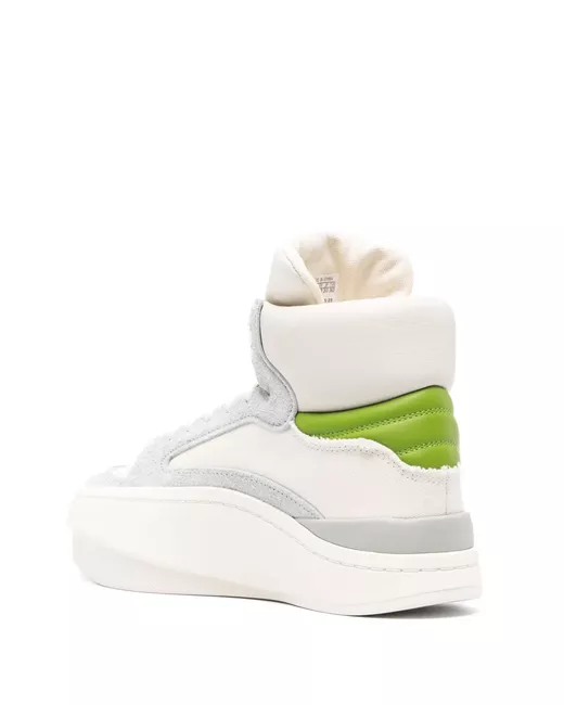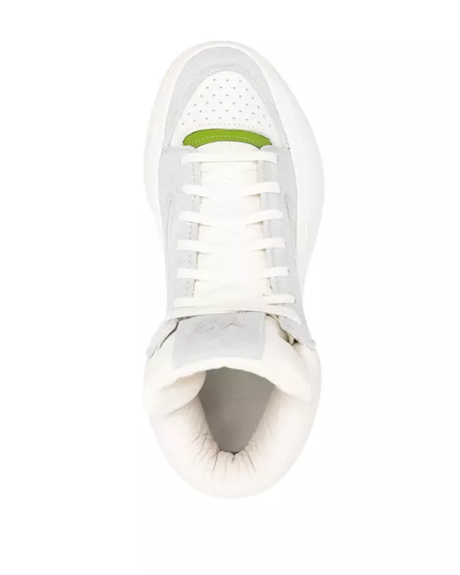 off-white/apple green/light grey calf leather suede canvas panelled design front lace-up fastening round toe perforated toebox logo patch at the tongue padded ankle chunky rubber sole