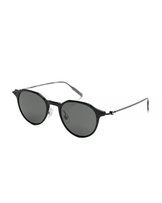 black round frame grey tinted lenses lens decal logo plaque at the arm straight arms curved tips nose pads These glasses come with a protective case.