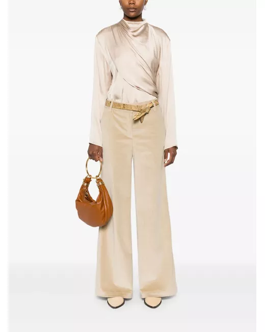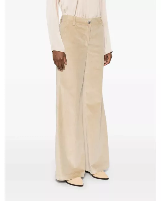 beige cotton blend corduroy concealed fly and button fastening belt loops high waist two side slit pockets two rear jetted pockets logo patch to the rear straight leg flared hem