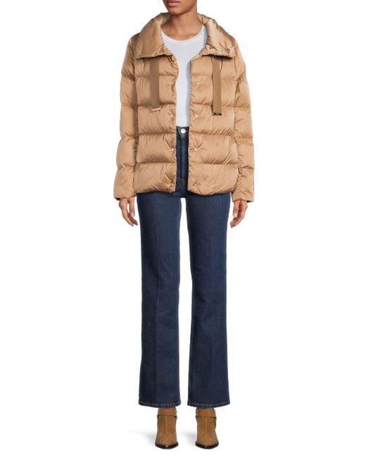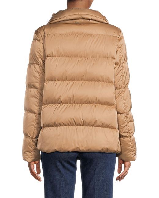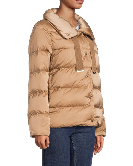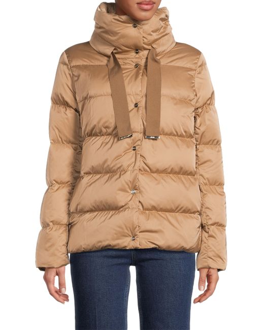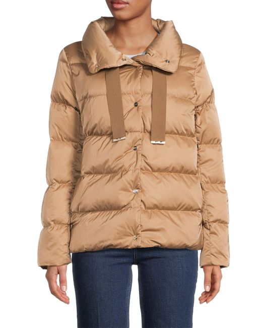 Designed with a sateen quilted shell, Herno's puffer jacket features a warm goose-down fill and an exaggerated drawstring stand collar. Goldtone snap closures complete the outerwear look. Stand collar Long sleeves Side-seam pockets Front snap closure 100% polyester Lining: 100% polyamide Fill: 80% goose down/20% feathers Dry clean Imported SIZE & FIT Model measurements: 5'10" tall Model is wearing a US size 4. Outerwear And Swimwear - Down > Herno > Saks Fifth Avenue > Barneys. Herno. Color: Camel. Size: 6.