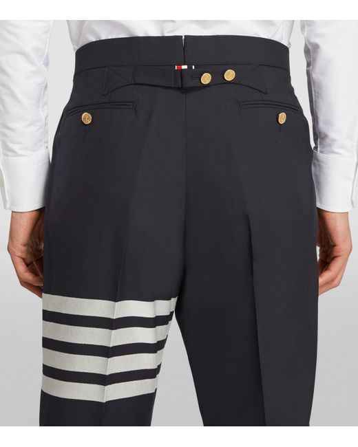 Classic, tailored separates with a modern twist has come to be the signature of New York-based Thom Browne, the label often credited for bringing men's formal wear into the modern age. These sleek trousers feature the brand's 4-bar striped motif down the leg: a sure sign of exceptional craftsmanship, and boast adjustable, gold-buttoned backstraps that make them customisable to your body.