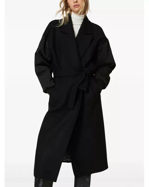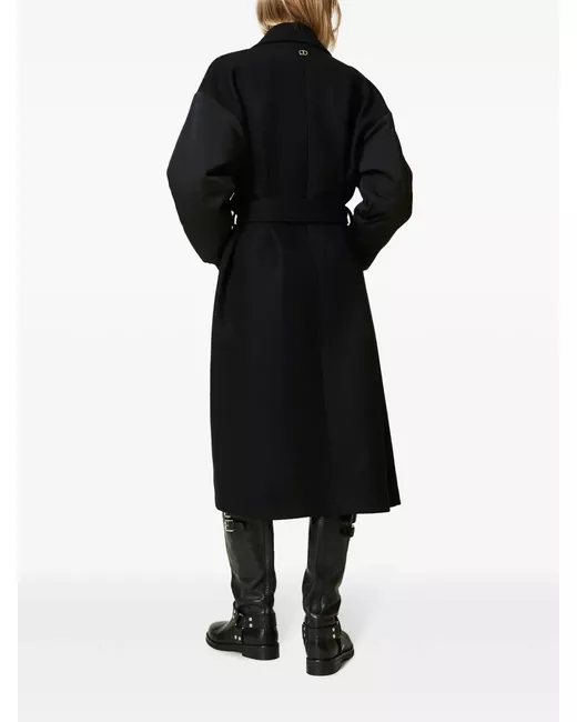 black wool blend felted double-breasted button fastening notched lapels drop shoulder long sleeves belted waist two side welt pockets straight hem mid-length