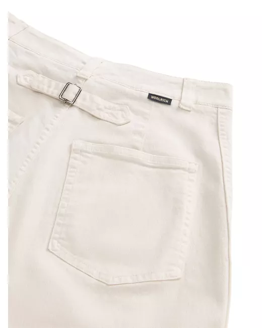 white cotton blend garment dyed front button and zip fastening belt loops two front patch pockets two rear patch pockets decorative buckle detail logo patch to the rear wide leg