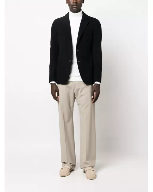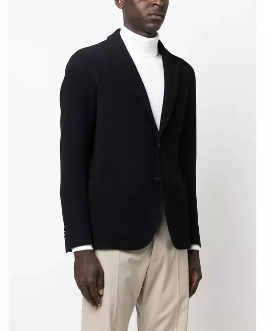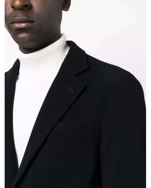 midnight blue herringbone notched lapels front button fastening long sleeves buttoned cuffs chest patch pocket two side patch pockets straight hem