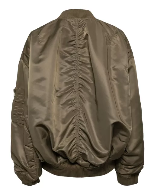 beige down-feather filling satin weave front zip fastening baseball collar sleeve patch pocket two side flap pockets ribbed cuffs and hem