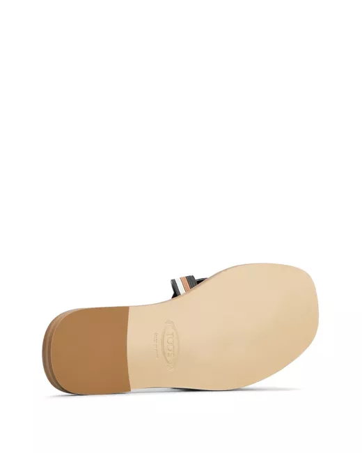 black/white/brown calf leather smooth grain panelled design tonal stitching square open toe slip-on style single toe strap branded footbed rubber sole