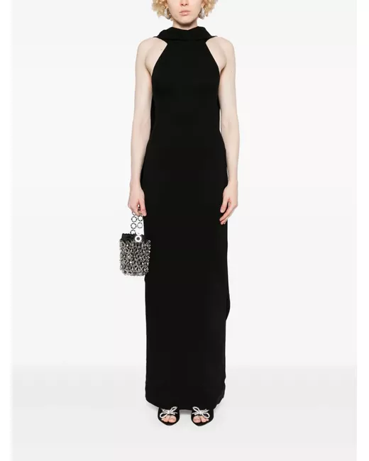 black cady texture concealed rear zip fastening attached scarf high neck adjustable spaghetti straps fitted waistline bias cut to the rear full lining column silhouette straight hem ankle-length