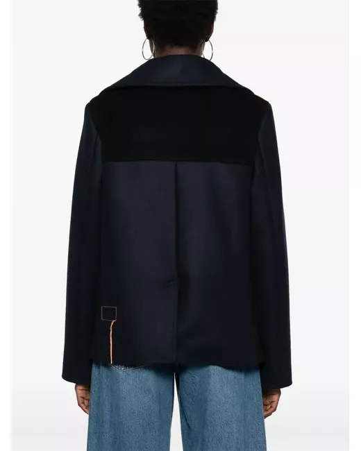 black/blue wool blend felted panelled design colour-block design double-breasted button fastening notched lapels long sleeves two front jetted pockets American rear vent full lining straight hem