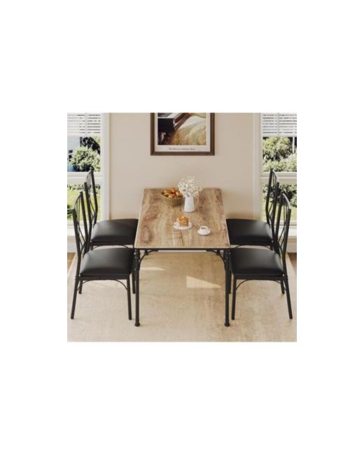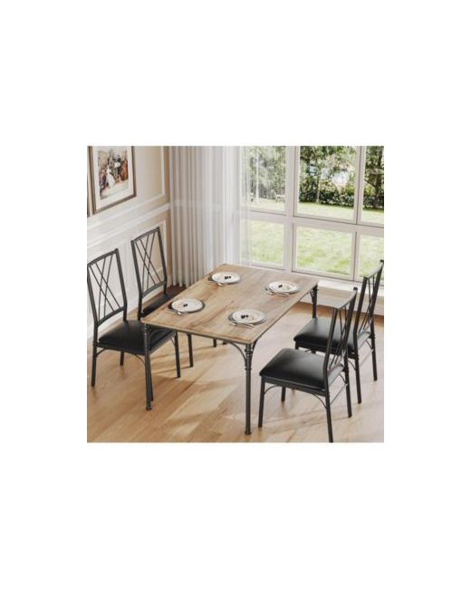 The spacious tabletop provides ample room for 4 to 6 people, making it perfect for family meals, gatherings, or entertaining guests.Each chair is designed with upgraded padded seats, featuring thick cushions that ensure comfort throughout your dining experience.Constructed with a thickened metal frame and quality particle board, the set boasts a robust structure that enhances stability and durability.The upgraded tabletop angle not only adds to the aesthetic appeal but also ensures safety for all your dining activities.The table and chair set is designed with versatility in mind, making it an excellent choice for small kitchens, dining areas, and living rooms. Its compact size allows it to fit seamlessly into various spaces while providing a functional area for a range of activities. Whether you're enjoying a meal, hosting game night with friends, or engaging in other leisurely pursuits such as playing cards or board games, this set caters to your needs.