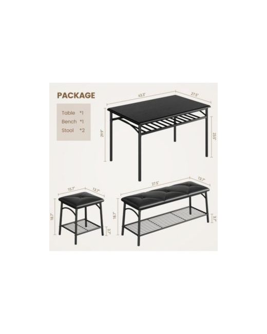 The spacious dining table set consists of a rectangular table, two stools, and a long bench, providing a versatile solution for creating the perfect dining atmosphere for gatherings with friends or family. This arrangement allows you to customize and organize your space to suit your preferences.The dining table is designed with a practical storage rack that maximizes storage in limited areas. It offers generous space for keeping magazines, books, wine, napkins, and other essentials organized and easily accessible.Offered in three colors with a natural wood finish, this kitchen table with bench exudes a modern and sophisticated vibe, harmonizing effortlessly with any home decor style.Flexible in its use, this kitchen dining table set can also serve as a computer desk, study desk, writing desk, or breakfast nook. Its adaptability makes it suitable for various environments, including the kitchen, dining room, living room, party room, restaurant, or bar.