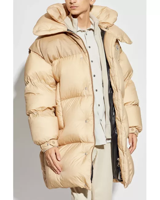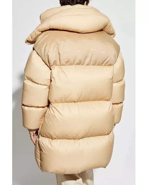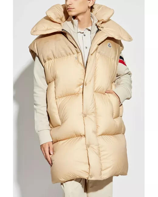 sand beige down-feather filling padded design panelled design front press-stud and zip fastening funnel neck jacquard logo motif logo patch at the chest detachable long sleeves elasticated cuffs internal drawstring fastening waist two side zip-fastening pockets full lining drawstring hem