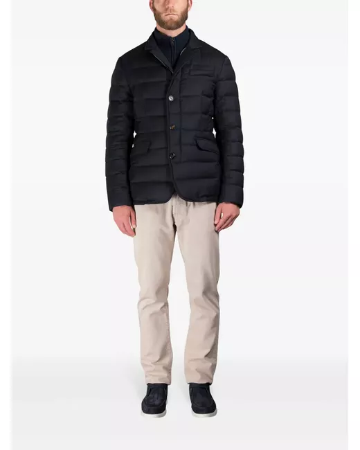 blue goose down virgin wool blend padded design lightweight mélange effect front button and zip fastening notched lapels long sleeves chest welt pocket two side flap pockets internal logo patch internal zip-fastening pockets straight hem