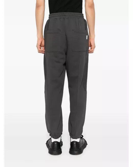 dark grey cotton blend panelled design elasticated waistband with internal drawstring two side welt pockets two rear patch pockets ribbed ankles