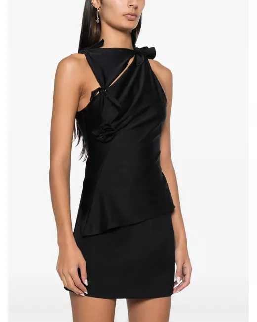 black satin weave floral appliqué side tie fastening round neck sleeveless cut-out detailing side slits straight hem