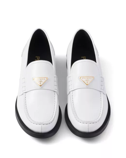 white calf leather brushed effect slip-on style enamel triangle logo moc stitching gold-tone hardware round toe branded leather insole contrasting rubber sole