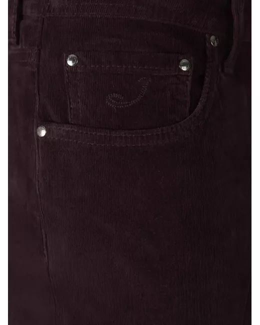 dark purple cotton blend corduroy front button and zip fastening belt loops classic five pockets logo patch to the rear slim cut