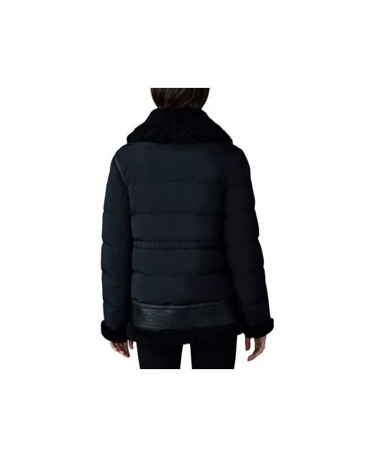 Mackage Vanna Mixed-Media Shearling Down Jacket.Color:Black.Size:L.Material:Shell & lining: 82% nylon/18% elastane spandex; contrast: leather; trim: real sheepskin shearling, origin: China, dyed; fill: 90% duck down/10% duck feathers.Coats.