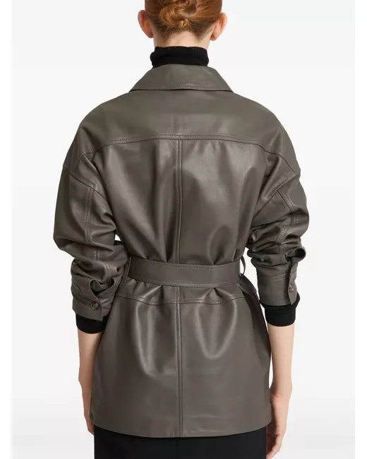 taupe grey lambskin front button fastening belted waist stitched-fold detailing four front flap pockets classic collar