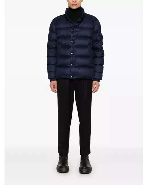 navy blue goose down padded design quilted flocked finish diagonal stripe pattern front press-stud and zip fastening high neck long sleeves sleeve patch pocket logo patch at the sleeve elasticated cuffs two side zip-fastening pockets quilted lining straight hem