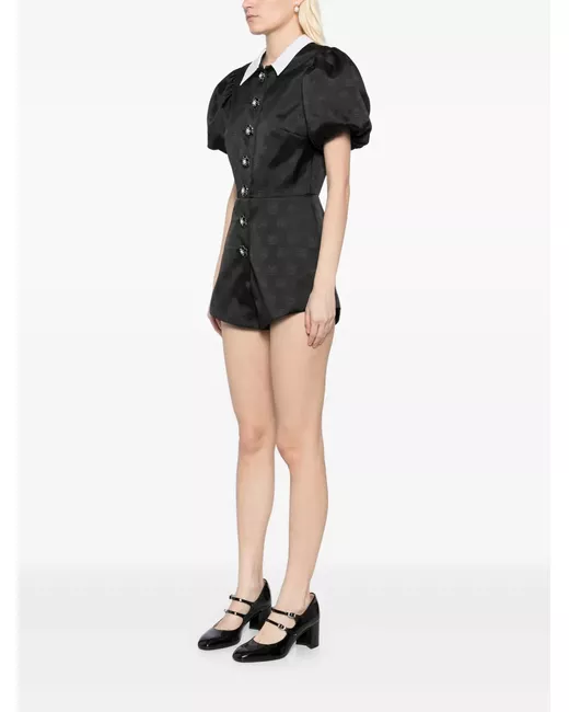 black jacquard logo motif front button fastening concealed rear zip fastening contrasting collar spread collar crest motif short puff sleeves fitted waistline thigh-high