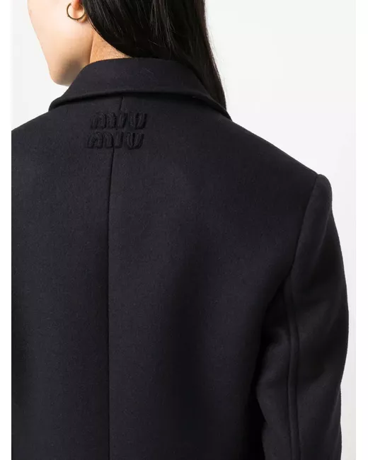 navy blue virgin wool notched lapels double-breasted button fastening two side flap pockets long sleeves straight hem central rear vent