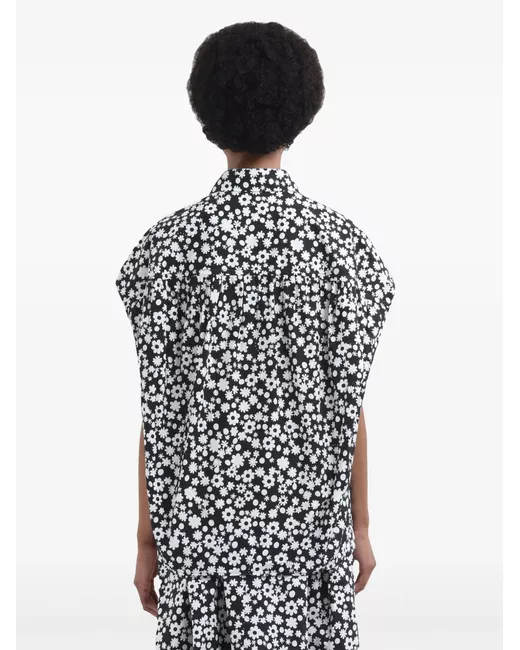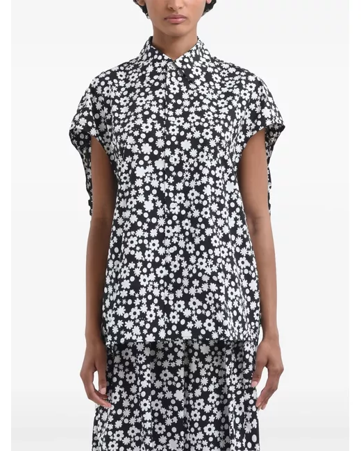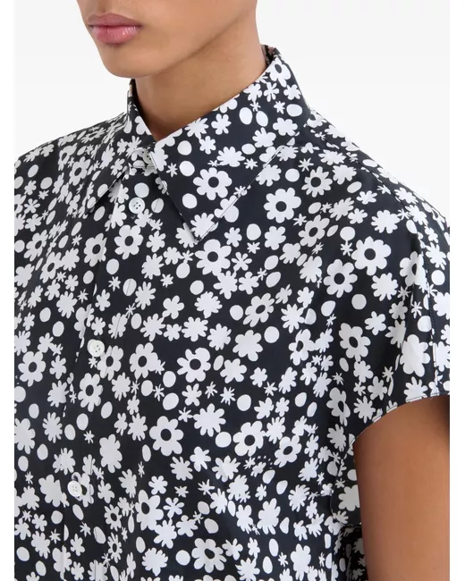 black/white cotton all-over floral print front button fastening straight-point collar cap sleeves curved hem