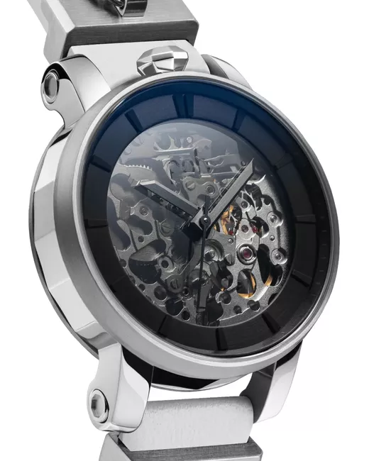 36mm silver-tone stainless steel skeleton dial stick hands round face automatic movement interchangeables straps buckle fastening water resistance up to 50m/5 ATM