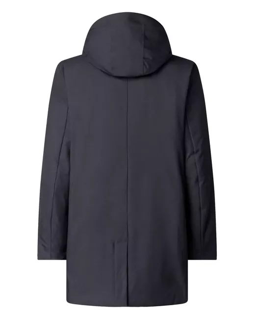 navy blue recycled polyester detachable hood padded design concealed front fastening classic collar long sleeves belted cuffs two side slit pockets straight hem