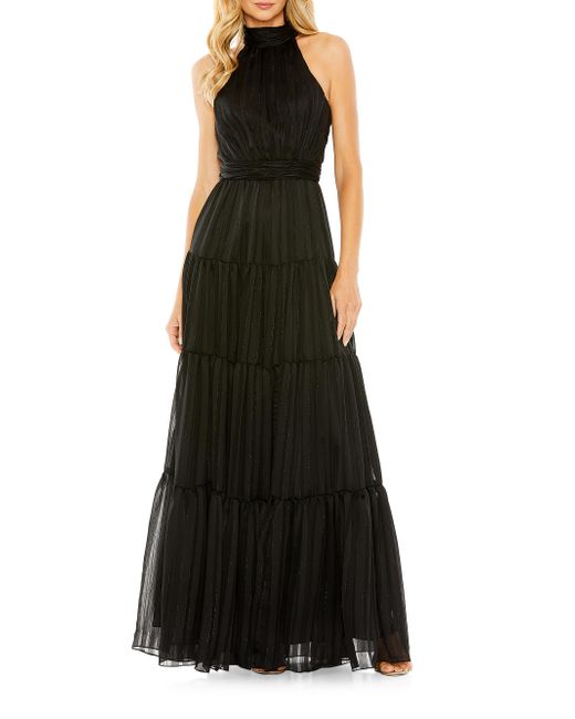 Crafted of flowing satin, this Mac Duggal gown is finished with a tie-halter neck and tiered skirt. Halter neck Sleeveless Back zipper closure 100% polyester Lining: 100% polyester Spot clean Imported SIZE & FIT About 62.5" from shoulder to hem Model measurements: 5'10" tall Model is wearing a US size 4. Dress Collections - Mac Duggal > Mac Duggal > Saks Fifth Avenue > Barneys. Mac Duggal. Color: Black. Size: 0.
