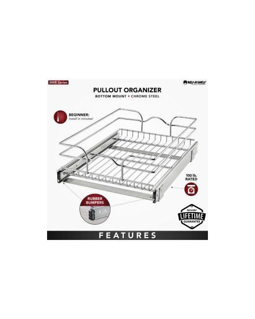 Easily access to pots, pans, lids, bottles, stand mixers, and other kitchen accessories with this single sliding basket kitchen storage organizer, the Rev-a-Shelf Kitchen Cabinet Pullout Wire Basket.This wire Pullout basket installs quickly and easily on the bottom of your kitchen cabinet. With smooth ball-bearing slides, the sturdy base stays in place as you Pullout the basket. This kitchen organizer is strong enough to hold up to 100 lb. allowing you to organize most of your kitchen essentials and allowing them to be easy to get to.