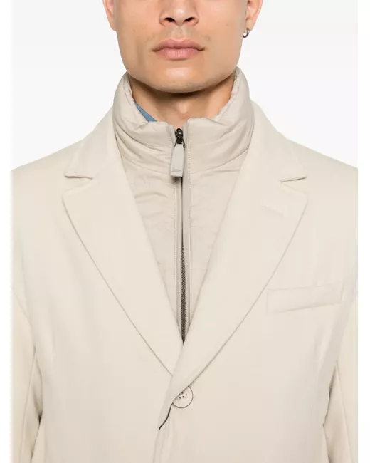 beige virgin wool padded design front button fastening removable layered details notched lapels long sleeves buttoned cuffs chest welt pocket dart detailing two front flap pockets central rear vent full lining internal pocket straight hem